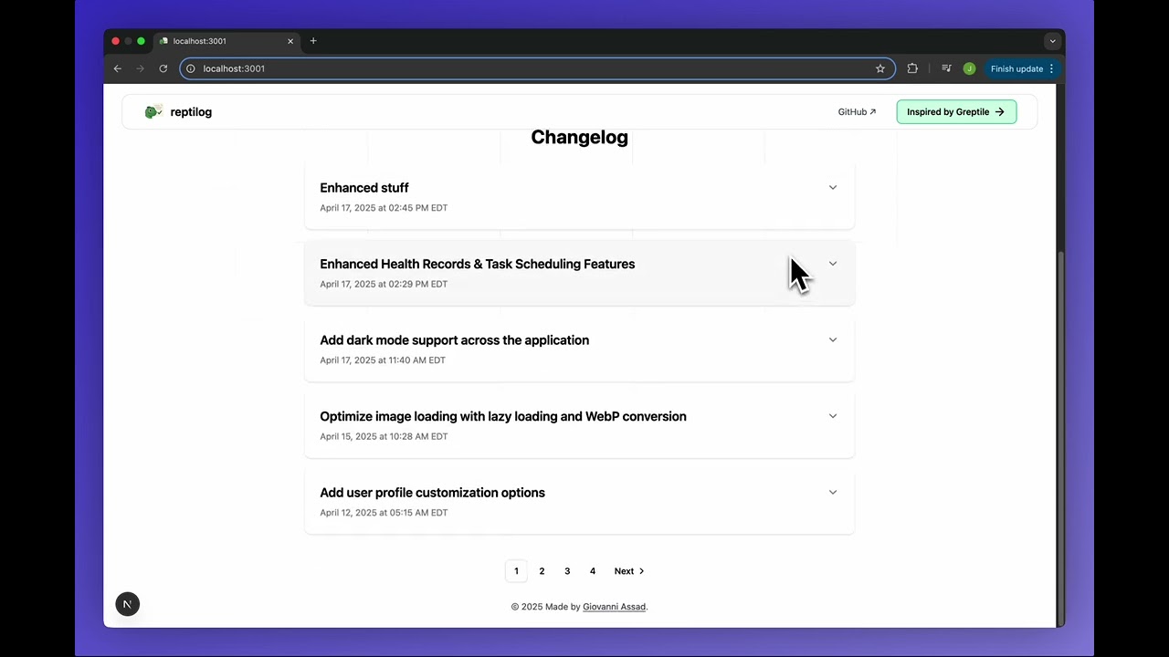 Frontend and backend for Reptilog (GitHub app) that automatically updates a website with AI-generated user-friendly changelogs based on PRs to production branches.