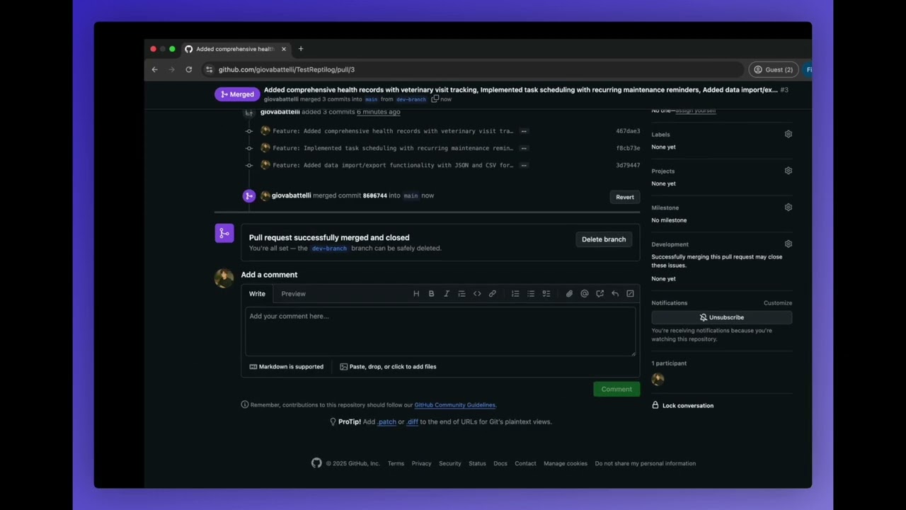 A big decision for me was how and when to create a changelog entry. Initially, I wanted to make it such that a developer could create a GitHub issue with a special tag, which would summon the reptilog and create the changelog for all of the commits between the most recent commit and the last changelog. I eventually settled on having the GitHub bot automatically create a changelog based on the commits of a pull request to a main/master branch.